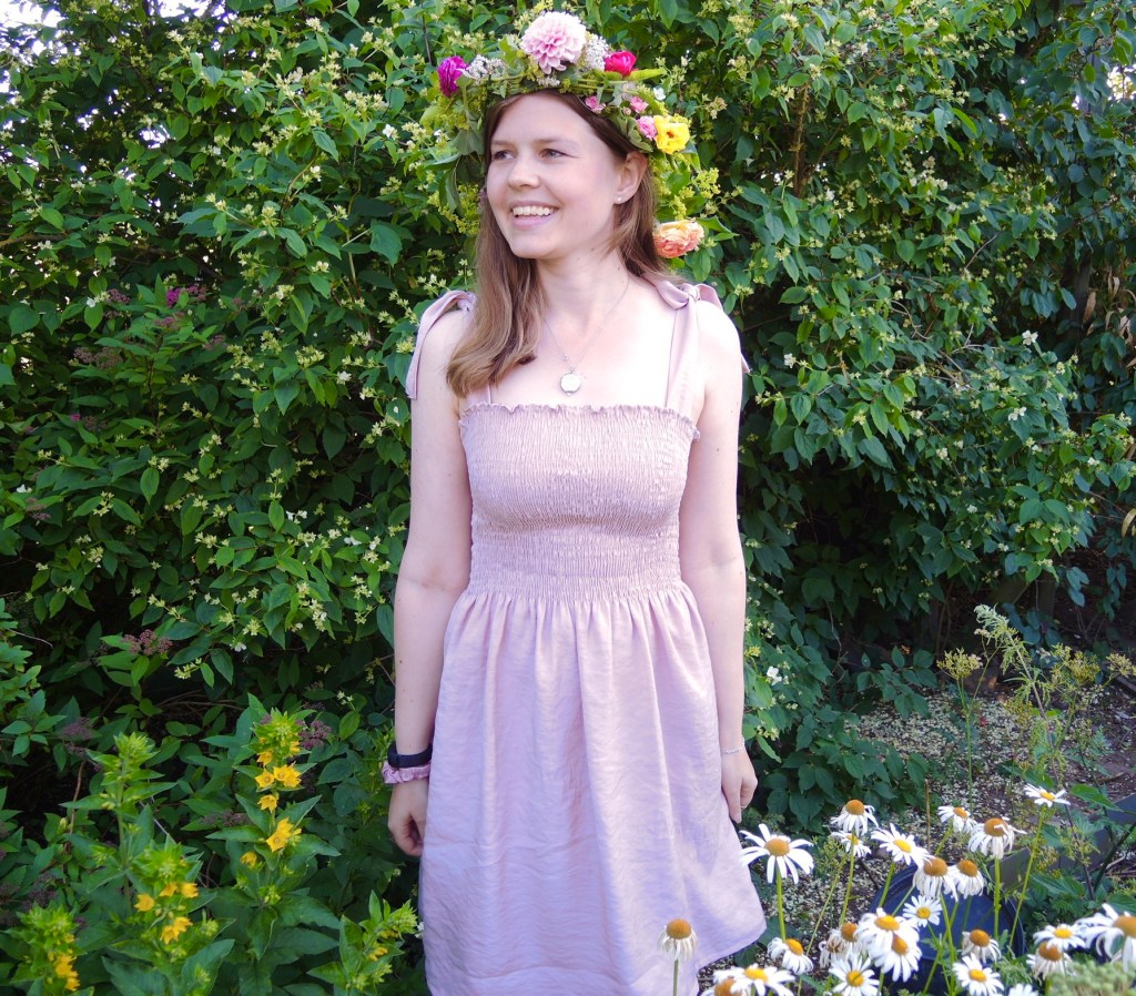 Och här ovan är det färdiga resultatet! Bilden gör inte klänningen rättvisa, tyget skimrar i solen på ett väldigt fint sätt! Senast jag använde den var dagen efter midsommar och då brände jag mig rejält. Denna klänning kommer åka med till Italien i augusti! Jag håller även på att sticka en t-shirt och sy ett par shorts som ska komplettera min Italien-garderob.