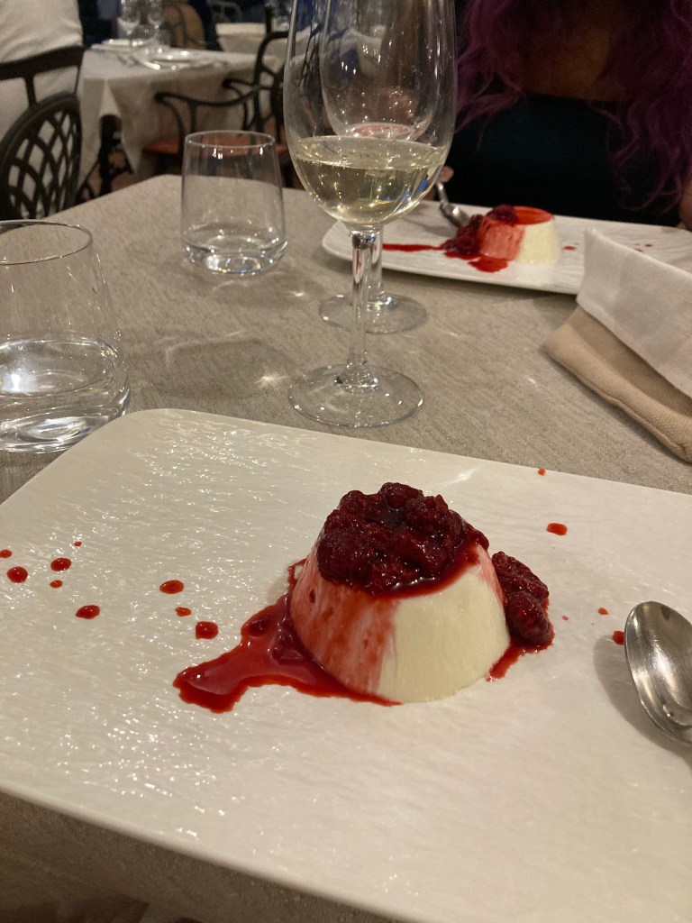 Vi gick även ner en sväng till byn för att köpa lite vatten, spana in busshållplatsen och få lite steg. Utöver det har vi skrivit en massa (vilket ju var det övergripande syftet med resan), hängt vid poolen och badat, ätit god mat och pannacotta och planerat kommande dagar.