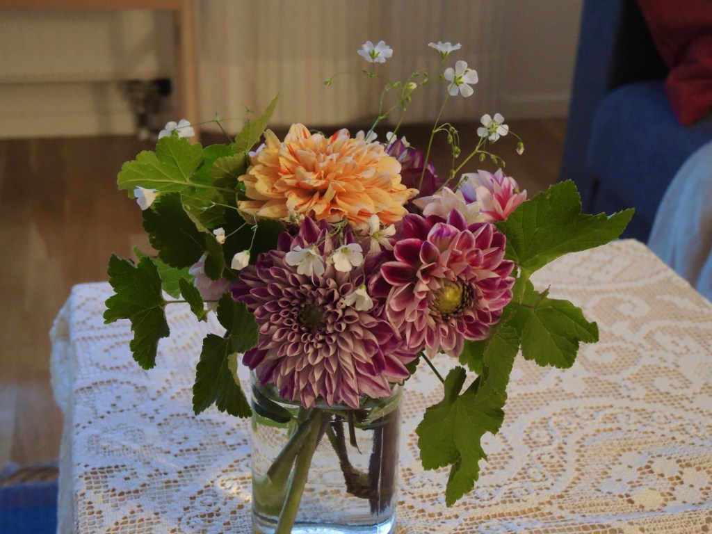 Här har vi en annan bukett från i sommar, när sommarslöjan blommade för fullt. Vilket lyft det blir mer lite utfyllnad bland alla dahlior!