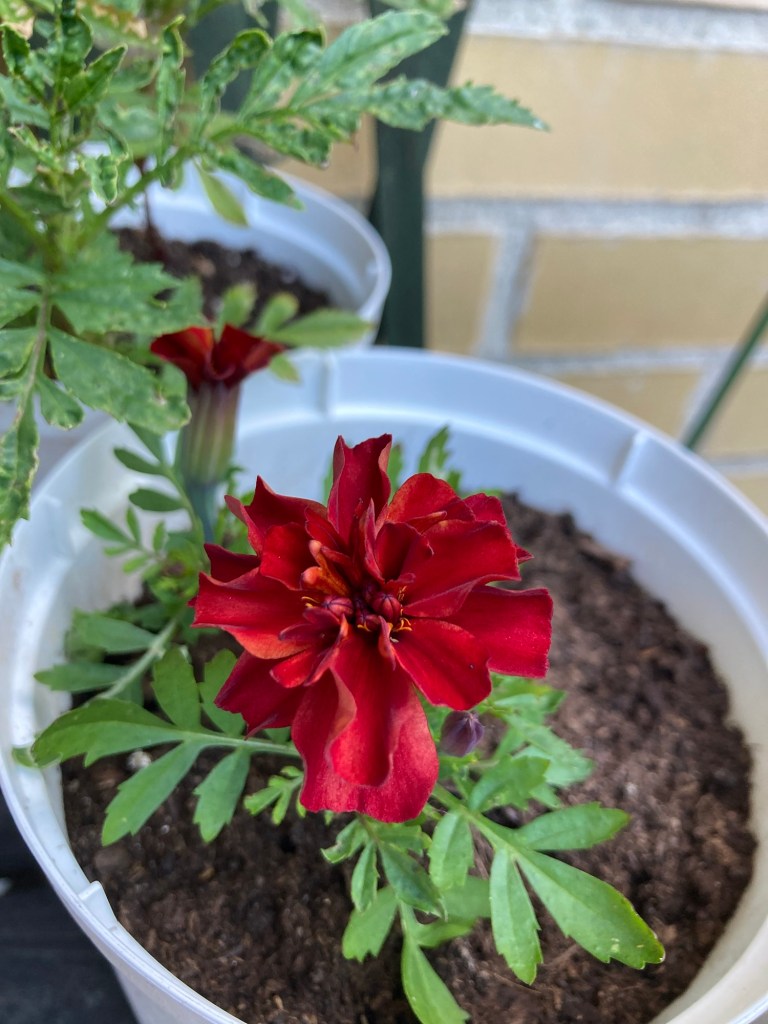 Nu börjar det blomma så smått på uteplatsen och vinbärsbusken bjuder på mängder av röda bär. Sommaren är här och jag älskar att se hur det händer grejer på uteplatsen. Några dahlior har slagit ut och idag fick jag beskåda en tagetes i sin fulla prakt. Snart hoppas jag kunna njuta av zinnior, aster, sommarslöja, vallmo, petunia och andra dahlior. Jag och min pojkvän har dessutom köpt en soffa med tillhörande kuddar som passar perfekt på uteplatsen.