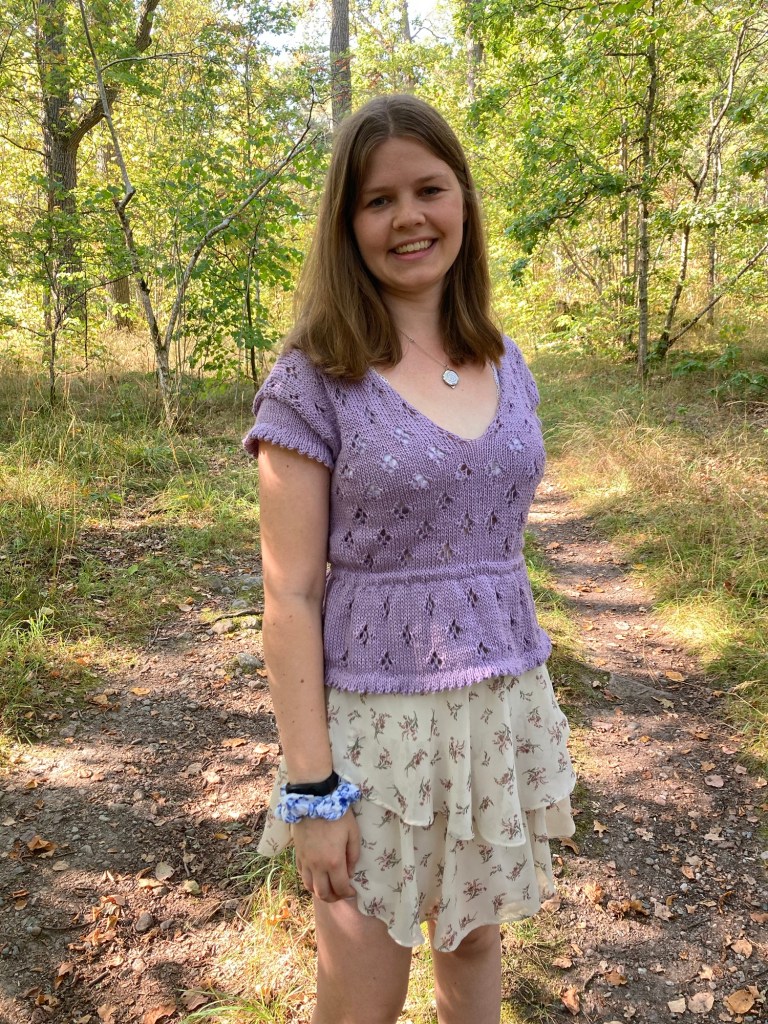 Senaste stickningen som blev klar är denna lila, hålmönstrade topp. Den halkar lätt av axlarna så jag har fått sätta fast ärmarna med säkerhetsnålar för att den inte ska glida av – men jag tycker den blev bra!