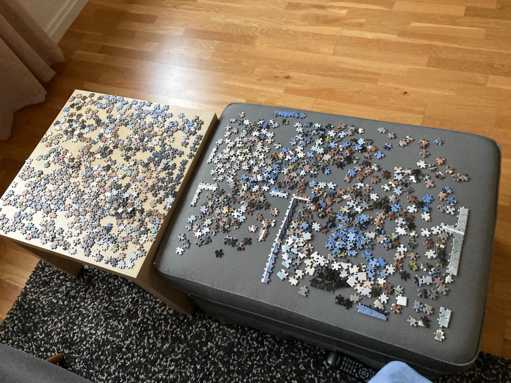 Erik fick ett pussel av mig i julklapp, med fyra bilder på oss som motiv. Vi har lagt mycket tid på att pussla klart det!