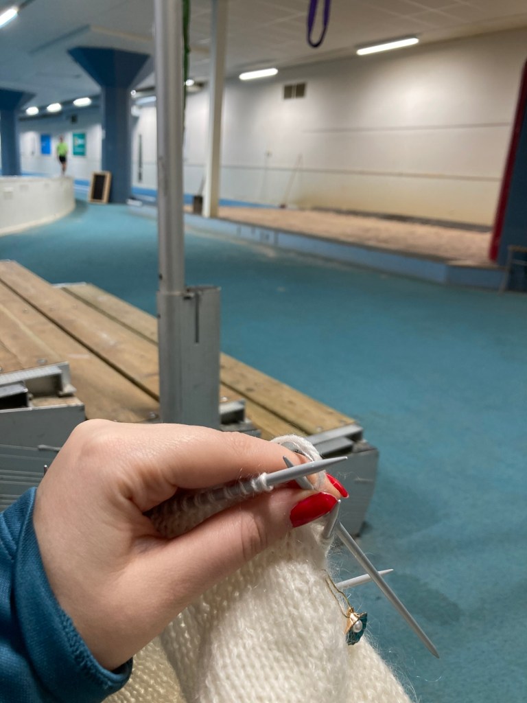Perfekt att kombinera olika intressen. Jag stickar och Erik tränar. Lite kallt i Munktellarenan dock, i alla fall för en som inte tränar.