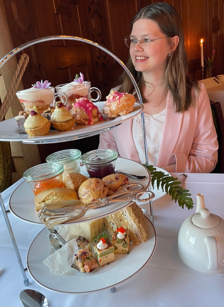 Det är inte första gången jag är där, så jag kan jämföra med hur det varit tidigt. Och det första jag vill säga är att det är inte billigt. Och denna gång var det inte så mycket snittar, scones och bakverk som det varit tidigare. Vi blev serverade vid bordet – längre tillbaka i tiden var det buffé och man kunde fylla tallriken flera gånger. Visst – en fin bricka i våningar ser läckert ut – men när vi hade ätit klart var jag ändå sugen på mer. Någon snitt till hade suttit fint. Gärna en scone eller två till. Och pajbiten som hörde till hade kunnat vara dubbelt så stor utan att ta någon plats på brickan.