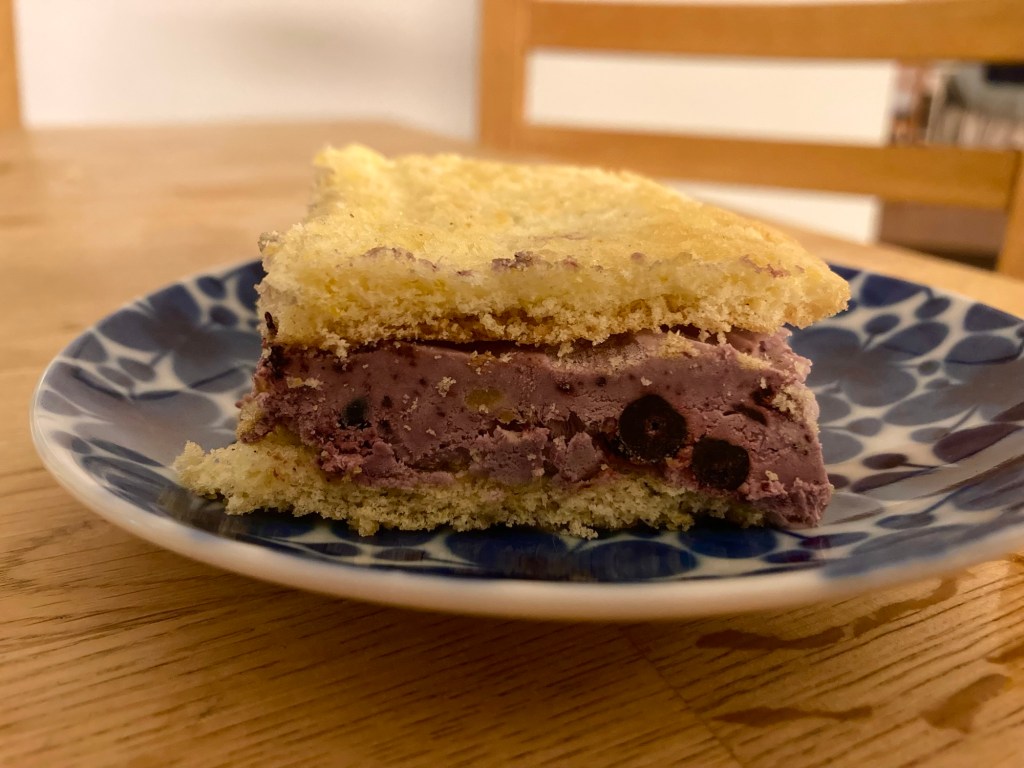 Denna veckans bakning var en slags sandwich. I mitten en slags blåbärsglass omringad av citronrulltårta. Godare än man kan tro!