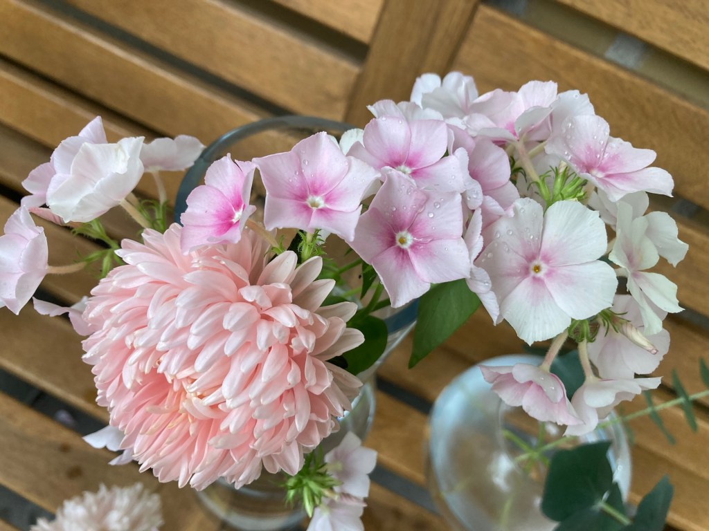 Dahlior, aster, eucalyptus, harört och min fina blushing bride-flox.