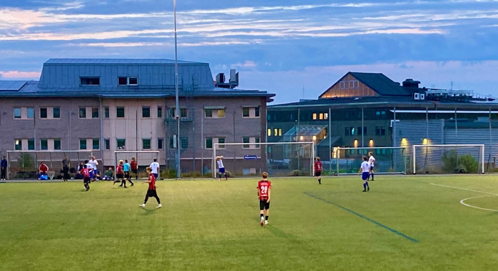 Häromkvällen spelade min systers man en fotbollsmatch på en av konstgräsplanerna precis utanför där vi bor, så vi gick dit och tittade. Vi hade haft picknick uppe vid Sisjön och picknickfilten kom väl till användning. Först som filt för kalla ben, sen som regnskydd och till slut använde vi det som en koja för att skydda oss från regnet. När det regnade allt för mycket använde vi filten, som har en plastig undersida som funkade väl mot regn, som paraply när vi sprang hemåt.