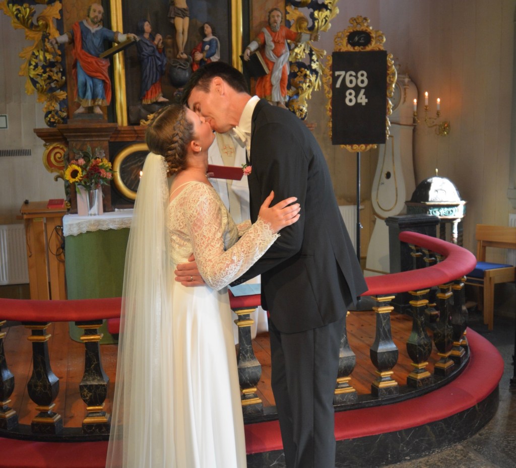 Sen stod vi där bakom dörrarna och jag minns att jag var så glad och taggad och inte alls nervös. Äntligen var det dags! Vi gick in till Aslan’s Theme, som min syster skrivit om till orgel, och jag minns hur jag tittade på våra gäster och log och strålade av lycka och glädje. Vi hade övat på att gå långsamt och det lyckades vi verkligen med!