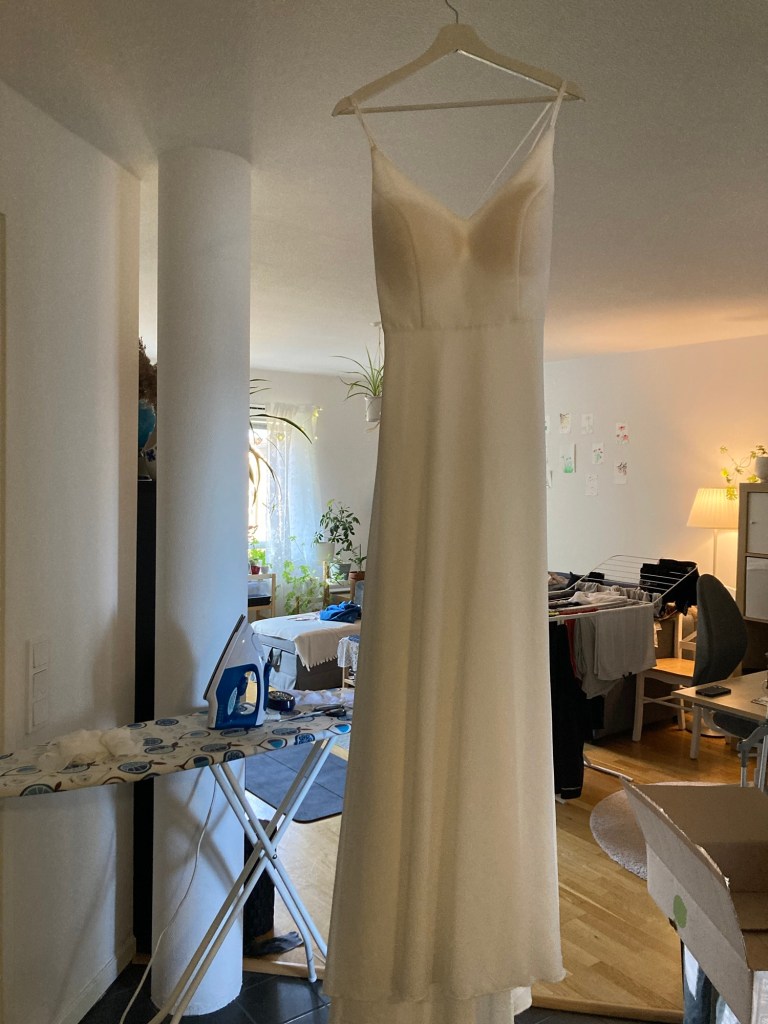 Här hänger hon och torkar i hallen. Jag provade den igen med ett rosa band i midjan och det funkar bra. Den känns inte lika mycket som min brudklänning utan spetstoppen och slöja. Kanske att man kan använda den på någon framtida bal – med rätt accessoarer.