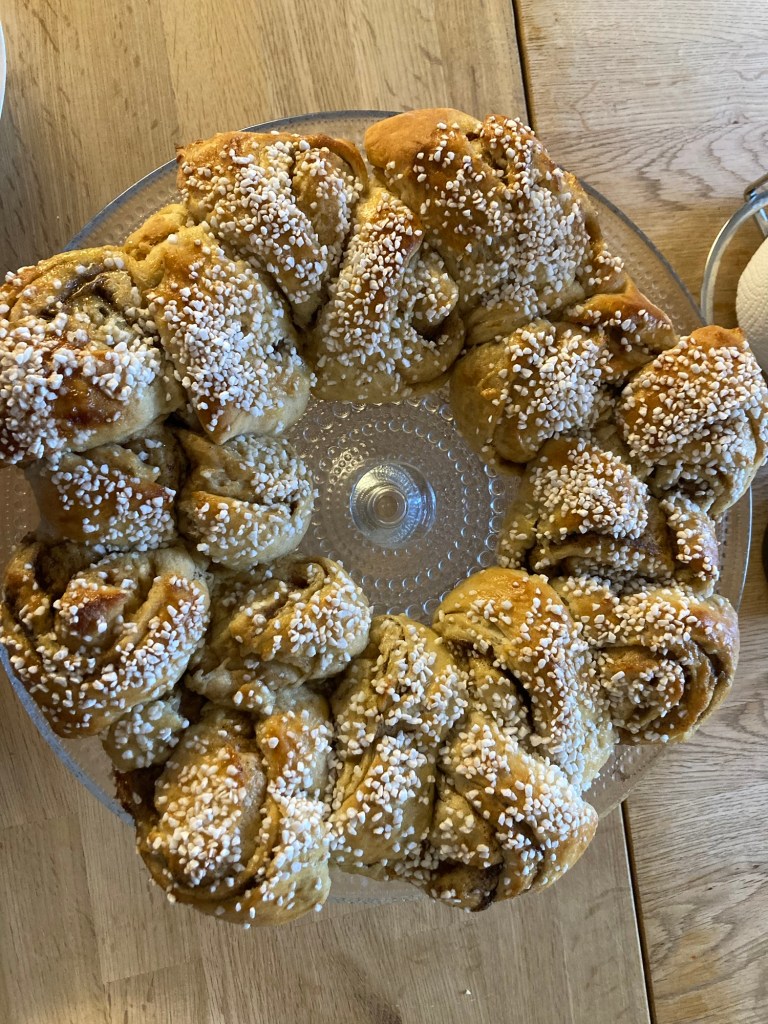 Utöver de friterade äppelknytena bjöd vi på kransar. Jag har aldrig tidigare bakat kransar men är nöjd med mitt första försök!